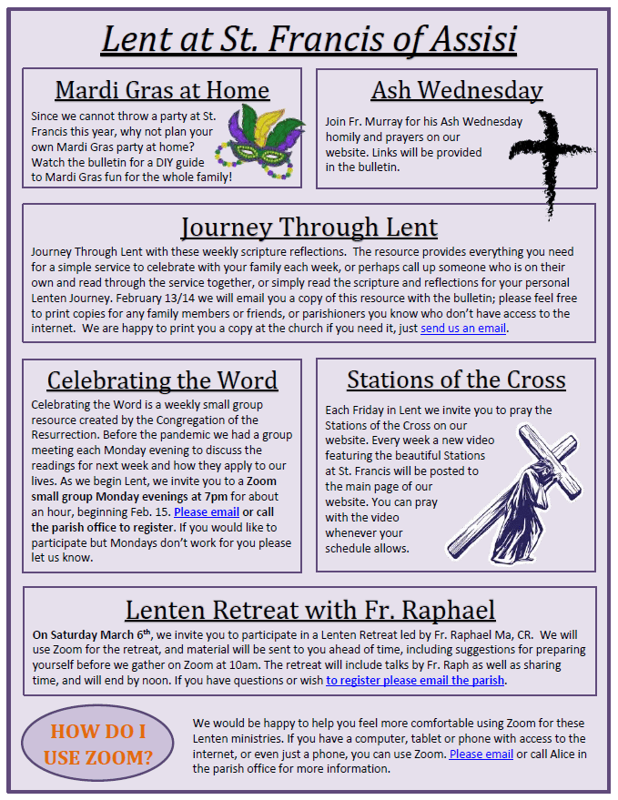 Lent at St. Francis Published on February 1, 2021February 16, 2021 by stfranciskw We are open for Ash Wednesday Mass! 9:00 am 12:15 pm 7:00 pm For more information please see our COVID Updates page by clicking here. Like Loading...