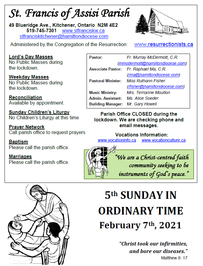 Homily & Bulletin for February 7, 2021 Published on February 6, 2021February 5, 2021 by stfranciskw Like Loading...