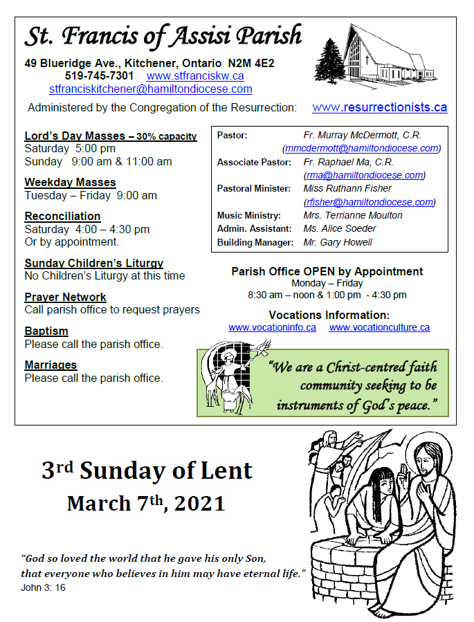 Bulletin & Homily March 7, 2021 Published on March 6, 2021March 5, 2021 by stfranciskw Like Loading...