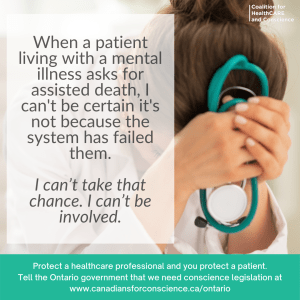 As Catholics, we are called to protect the most vulnerable members of our society and to see the inherent value in every human life. We need to be concerned about conscience rights for healthcare workers. Many healthcare profess-ionals have moral convictions that do not allow them to participate in assisted dying. They are being pushed out of their professions by provincial health regulators that insist healthcare providers must par-ticipate in MAID. No one should be forced to go against their conscience