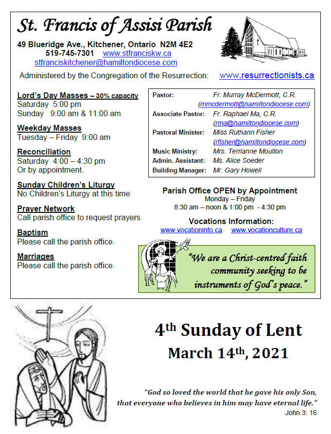Bulletin & Homily 4th Sunday of Lent Published on March 13, 2021March 12, 2021 by stfranciskw Like Loading...