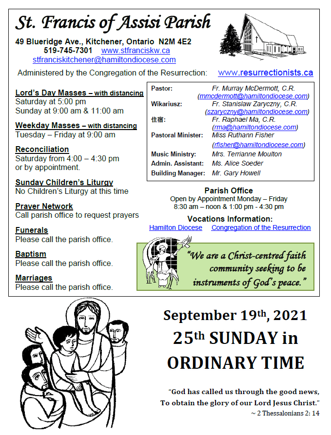 25th Sunday in Ordinary Time Published on September 18, 2021September 17, 2021 by stfranciskw Like Loading...
