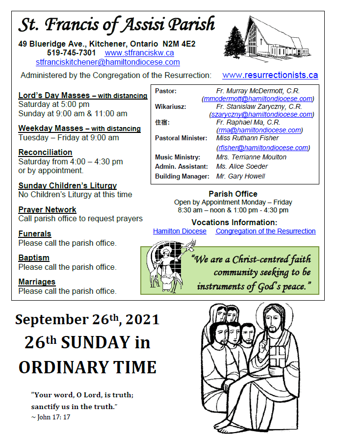 26th Sunday in Ordinary Time Published on September 25, 2021September 24, 2021 by stfranciskw Like Loading...