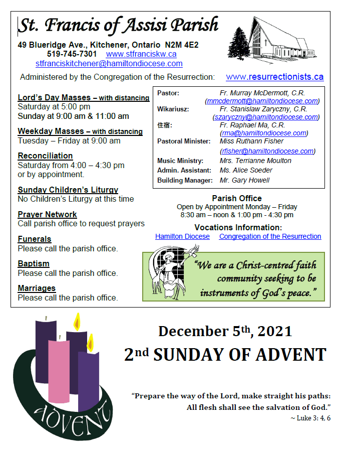 2nd Sunday of Advent Published on December 4, 2021December 2, 2021 by stfranciskw Environmental team december newsletter Like Loading...